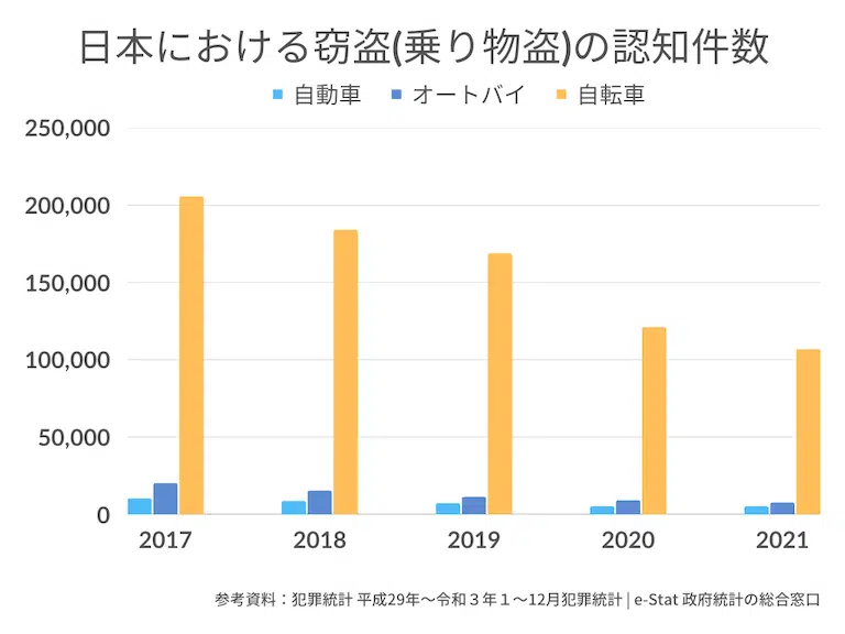 日本において窃盗で最も多いのが自転車。2021年の自転車盗の認知件数は106585件。届け出がない分も含めれば相当な数ですね。