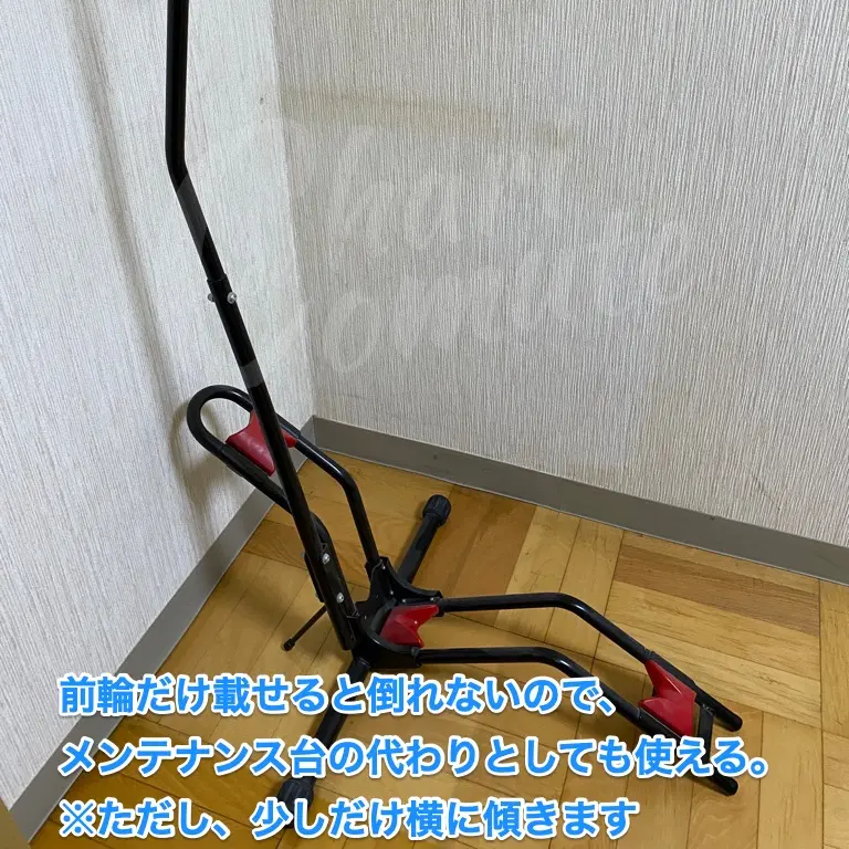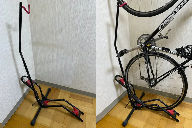 写真は縦向きにして前輪を引っ掛けておくタイプです。車体を縦向きにする手間とスタンドの脚がそれなりに幅を取るのが難点。